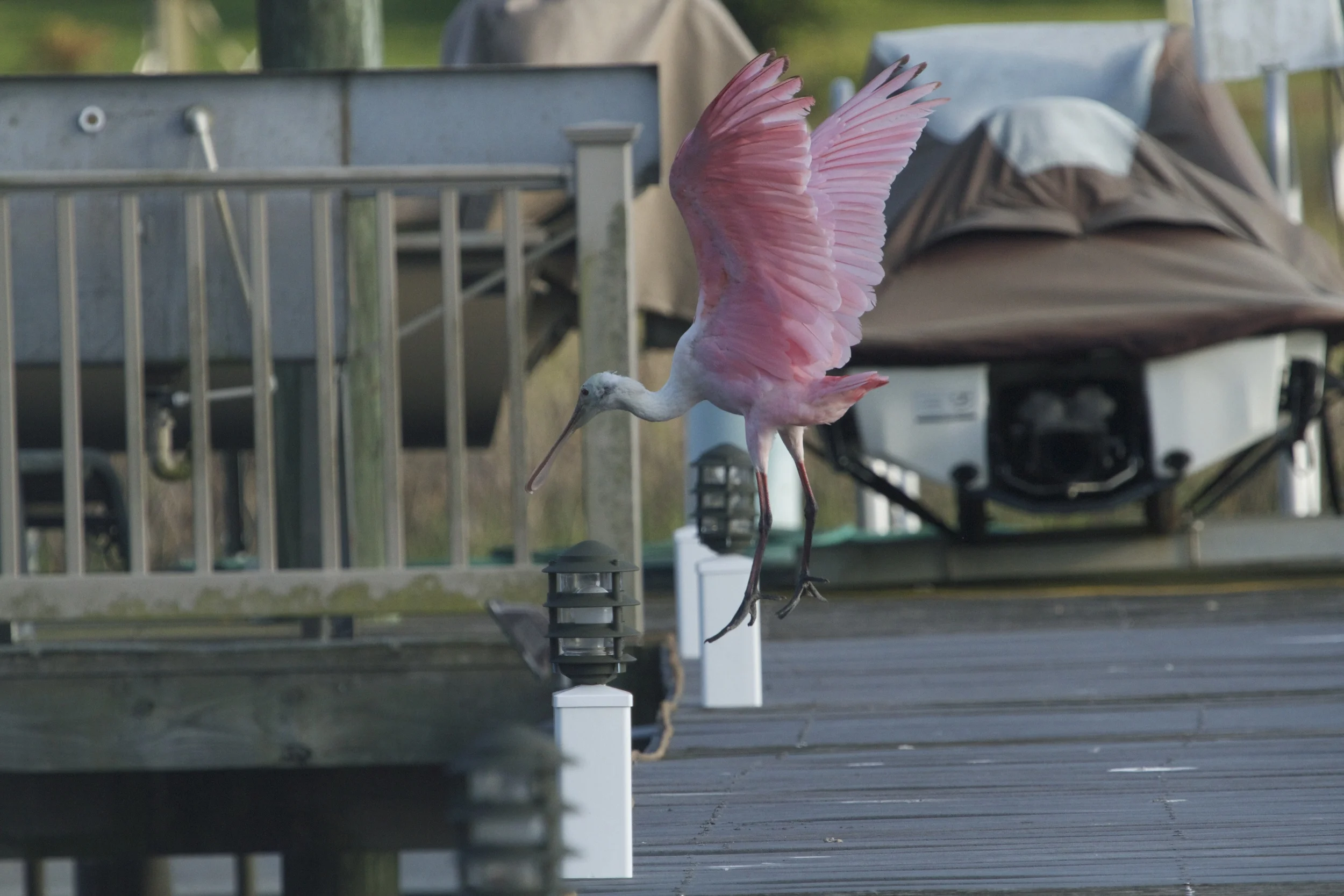 George hears me click the doohickey and turns his head in my direction. George covers up and jumps up on the dock.