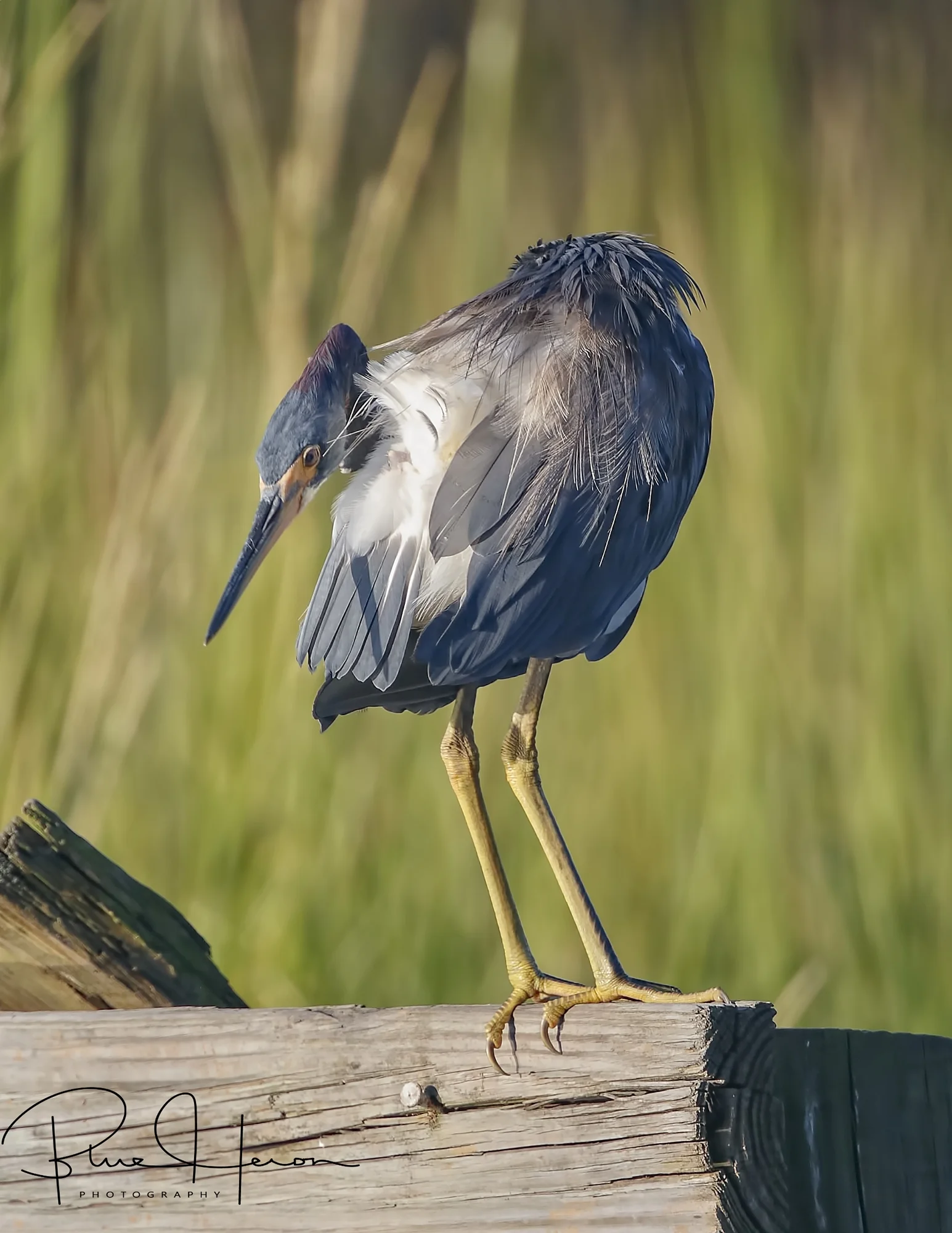 While on the dock recently I spotted a local Tricolored Heron hunting for minnows in the early morning light. I was hoping it would fly across the channel in front of me to hunt so I could get some good reflection shots but alas it had other things on its bird brain instead. After snacking on a few minnows, it flew over the lagoon to the old pier and began to preen. It reminded me of the Editor in some ways. That bird had to fix every feather on its body it seemed. My arms got tired holding the doohickey trying to capture each effort. It started under its wings, moved to the sides, then the back and even around to the its tail feathers. Meticulously it picked and preened and poked until each feather was just right. Then the neighbor’s dog spotted me and started raising such a ruckus I had to leave.